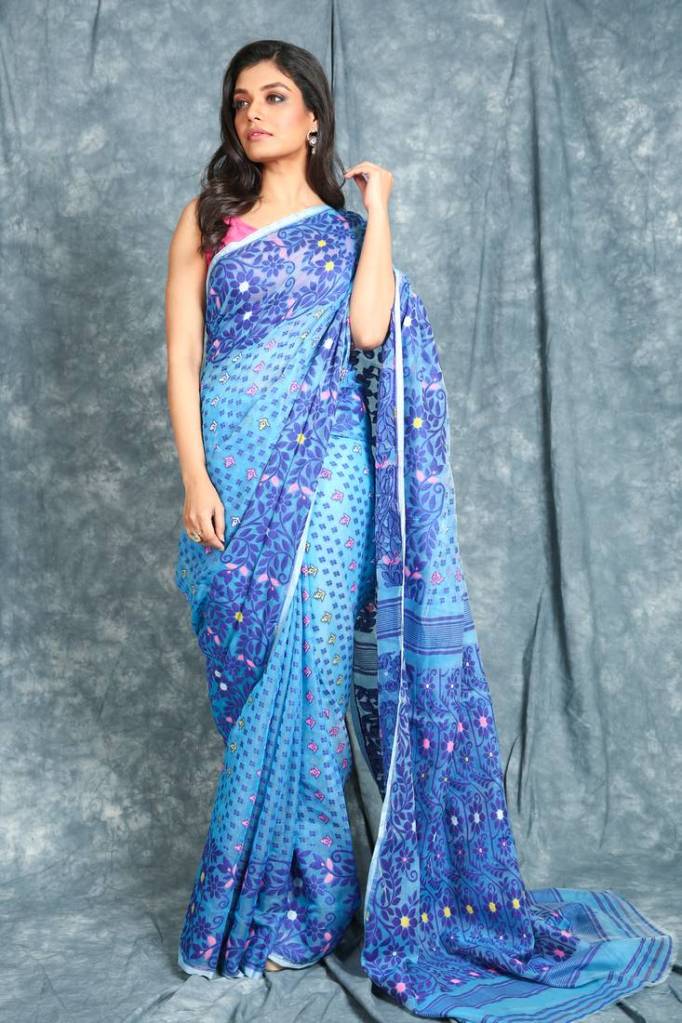 It is made in West Bengal’s Dhaniakhali. Bold hues and dark, contrasting borders are used to create this style of jamdani saree. Compared to the earlier variety of dhakai jamdani sarees, they have a much tighter texture. These sarees are typically found in deeper shades with some contrasting border colors.