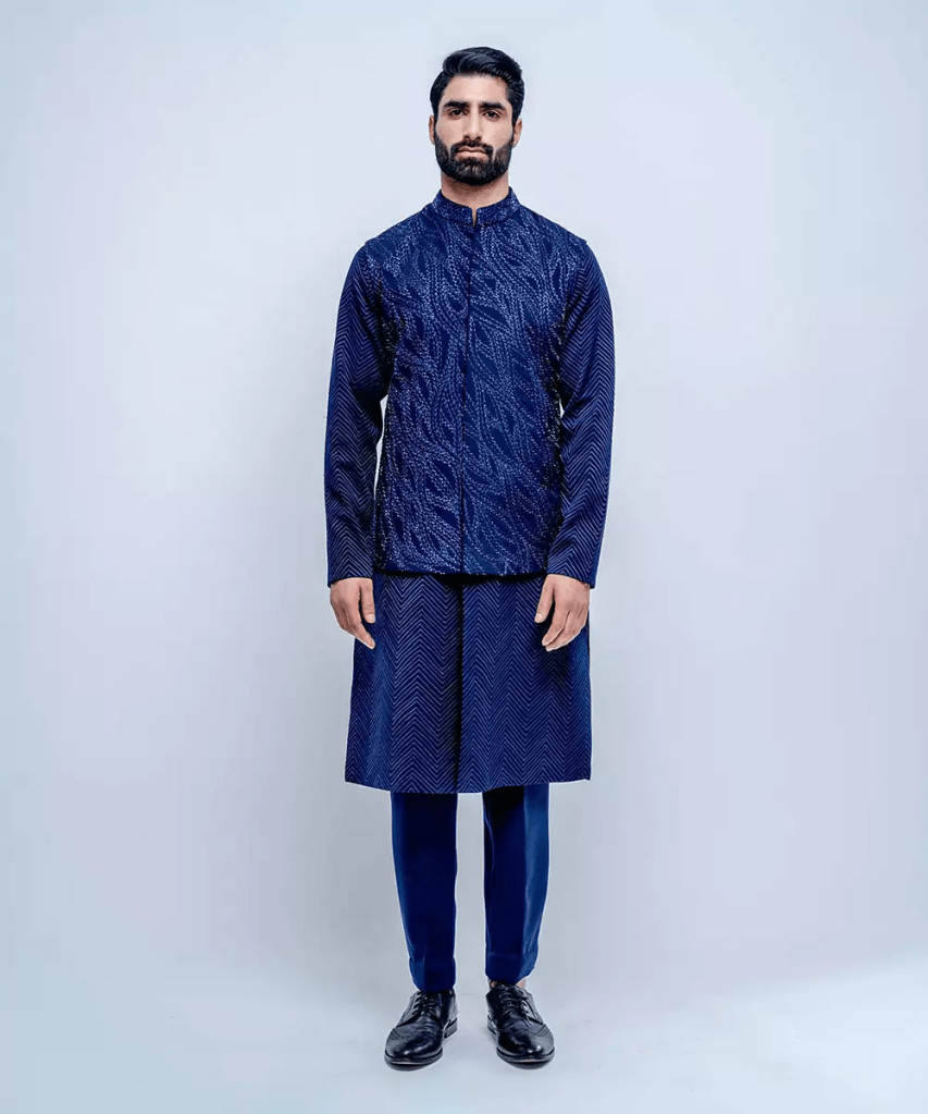 Men also have great outfit choices for the sangeet. A well-fitted kurta pajama set paired with a Nehru jacket is a timeless choice. If you want a more formal look, go for a bandhgala or sherwani. Bright and festive colors like maroon, navy, or ivory work perfectly for the occasion. These sangeet dress for men ideas are stylish and comfortable for a night full of dancing.