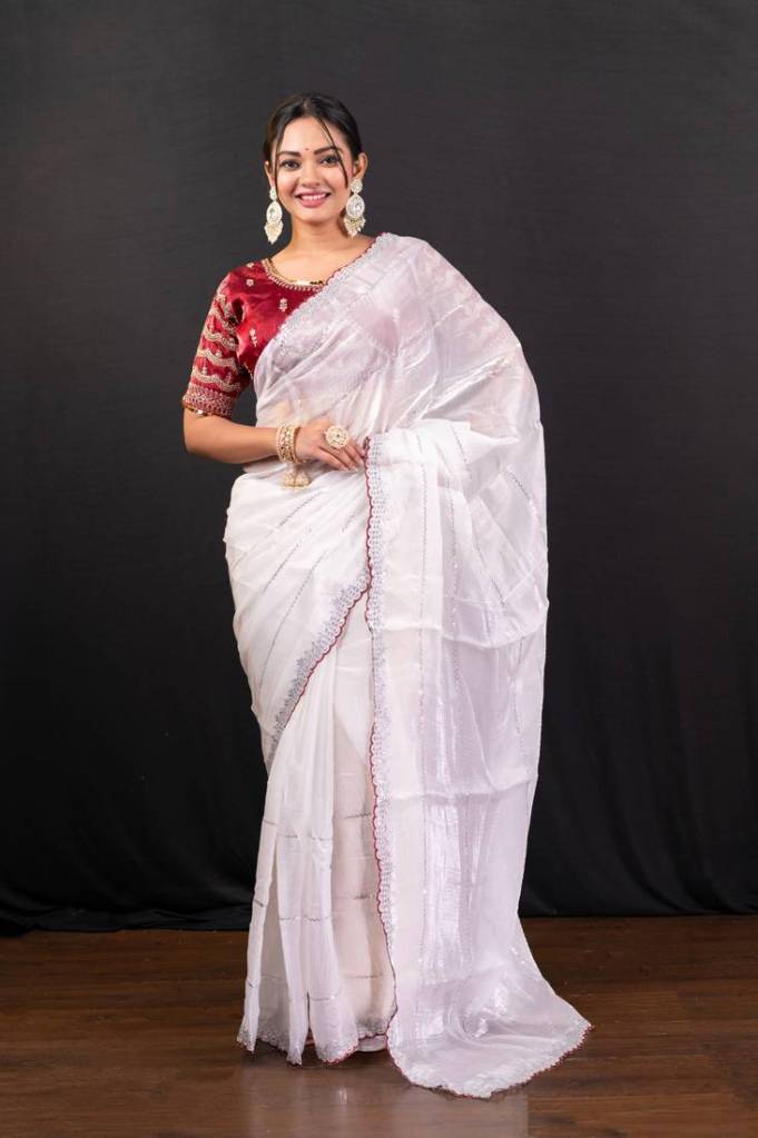 We kick off the celebrations with pure and serene white. Connected to Maa Shailputri, this calm color symbolizes clarity, peace, and purity. The Goddess is also known as the daughter of mountains. She represents divine power, nature, and strength. The color also symbolizes new beginnings, thus being the perfect color to start the festivities. Opt for a plain white saree in silk with a zari border in white to appear both pious and elegant.