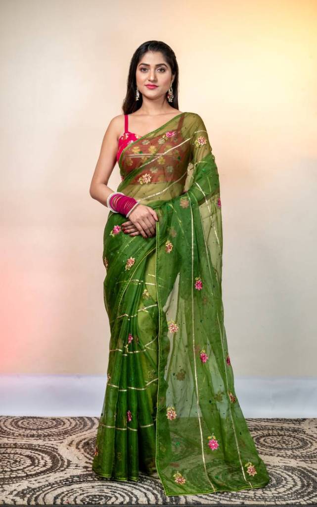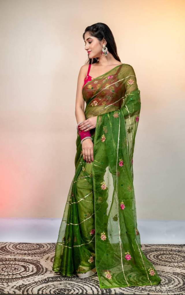 Mehendi ceremony is one of the most pre-wedding rituals where henna designs are applied to the bride’s hands and feet. Sarees are wonderful for this occasion as they look graceful, easy to dress up with and are also photogenic. The right saree can complement your personality and the festive spirit, whether you are a bride or bridesmaid or even just another guest.