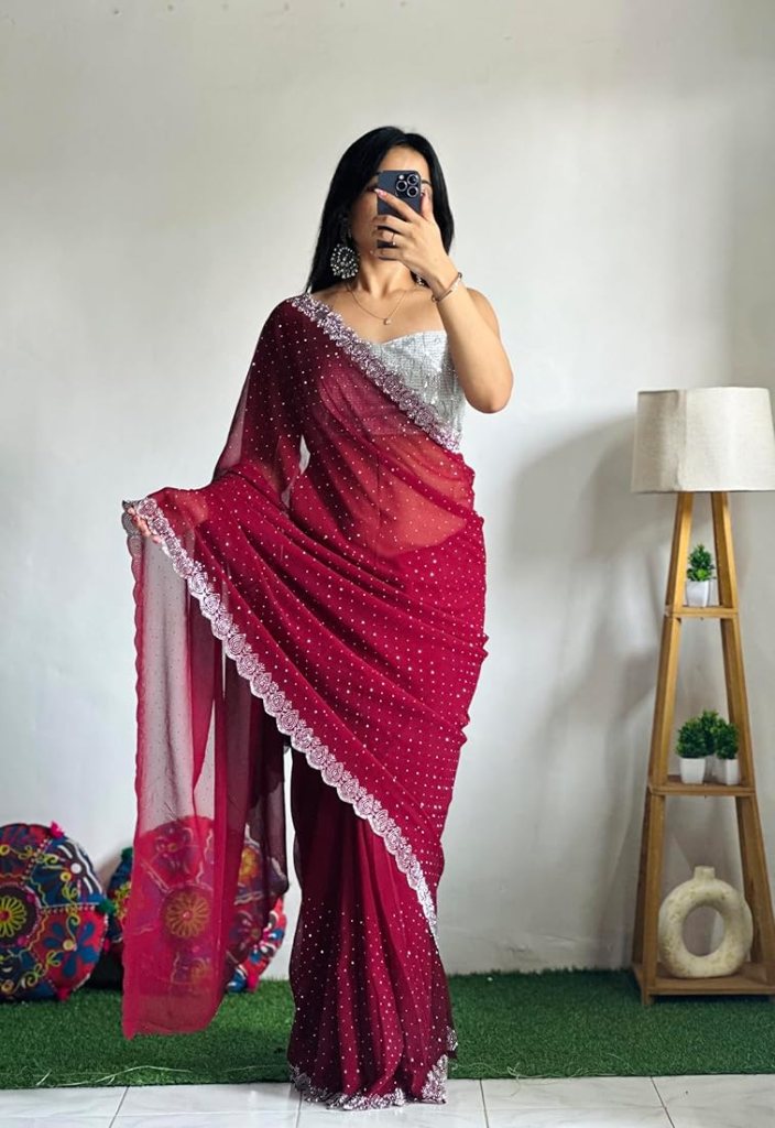 A maroon sari is so versatile when it comes to styling. With a good blouse color, it looks harmonious, elegant and suitable for various dress needs.
