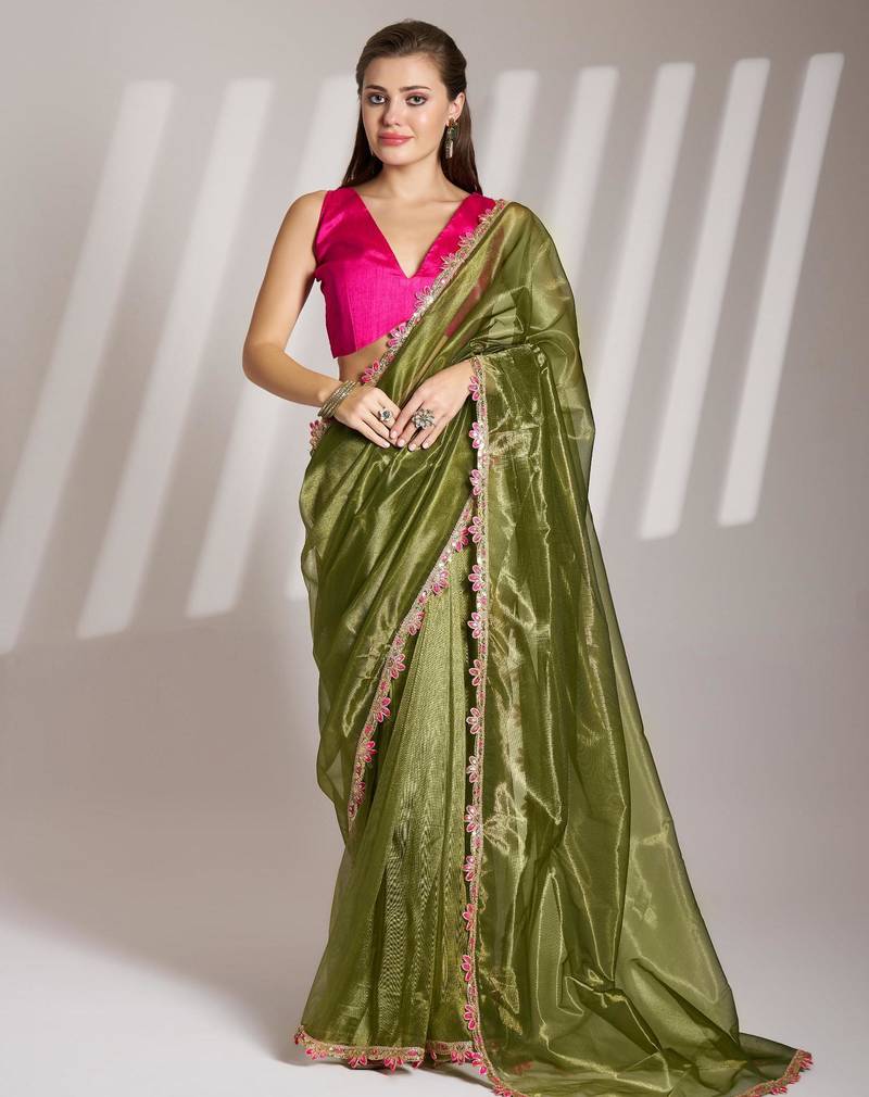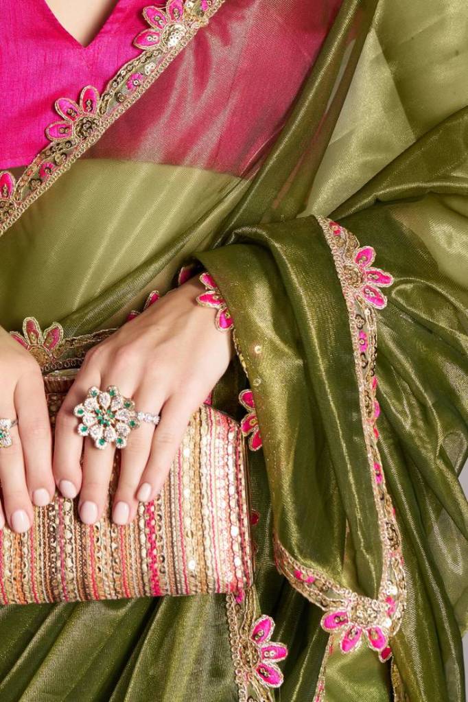 Green + Yellow / Olive is still one of the most popular mehndi colour combinations. The green represents the henna and yellow (or olive) brings warmth and celebration. It’s a fresh, evergreen and joyful mix – perfect for a daytime celebration. Opt for a yellow or olive-green light georgette saree or pastel chiffon saree, with minimalistic embroidery or zari border, you will look glistening without contradicting the earthy feel of the ceremony.