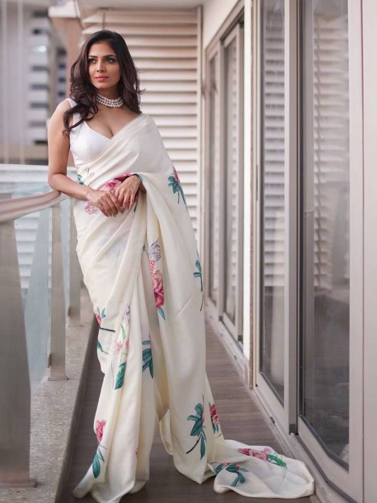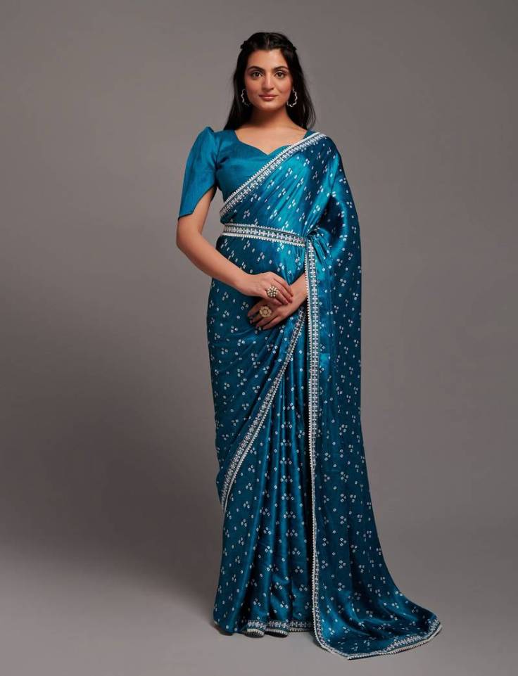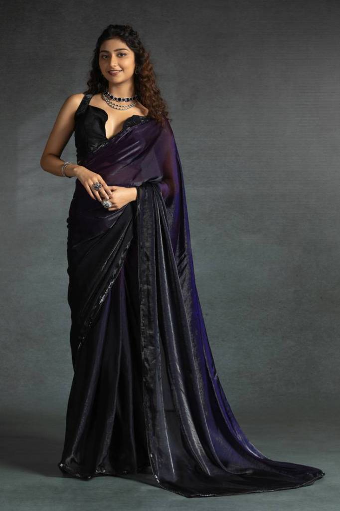 The saree remains simple while the blouses are at the center stage. Statement blouses such as high-neck designs, sleeveless styles, halter necks, and sequin details are trending in satin sarees.