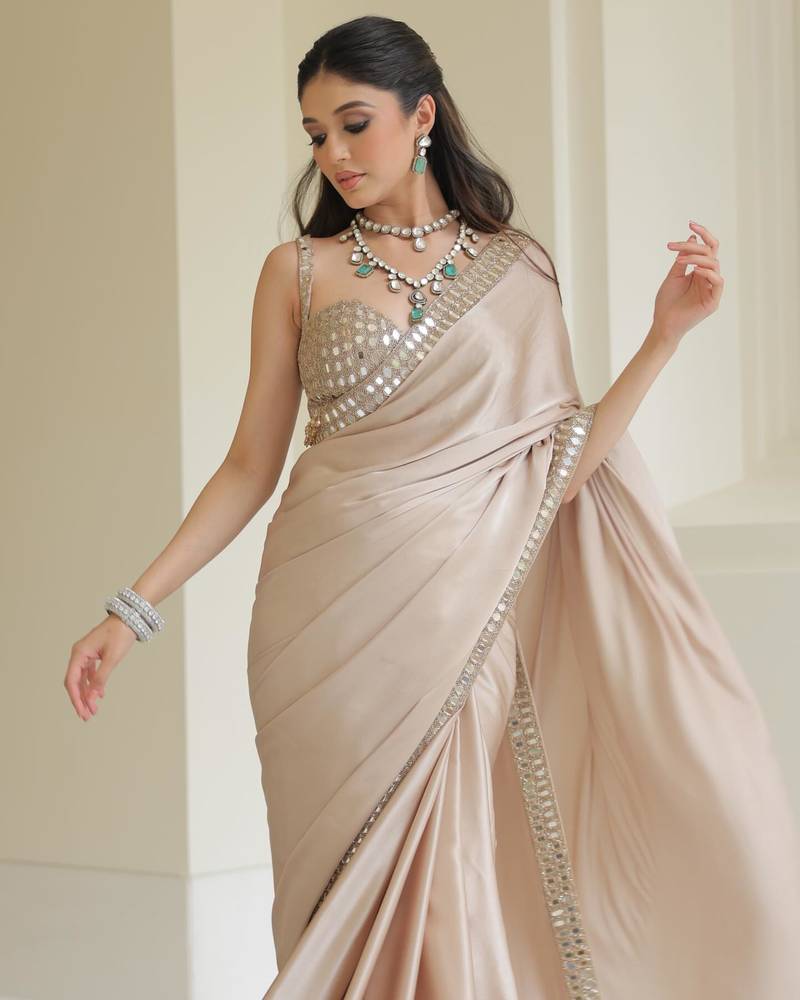 The saree remains simple while the blouses are at the center stage. Statement blouses such as high-neck designs, sleeveless styles, halter necks, and sequin details are trending in satin sarees.