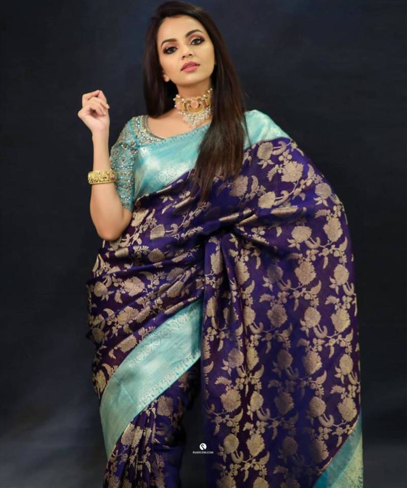 Gold jewelry is one of the most common choices with a royal blue saree. The warm shine of gold creates a beautiful contrast and gives the outfit a classic and elegant feel.