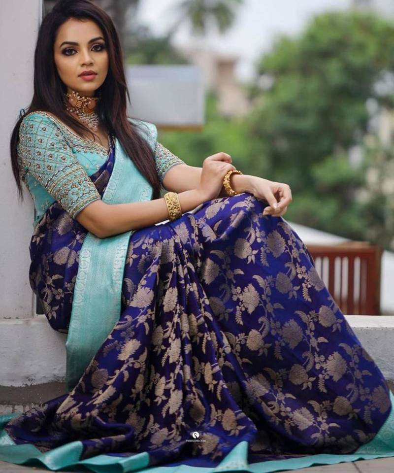 A royal blue saree already has a strong and attractive appearance. The right jewelry can make the look even more beautiful. Gold, silver, pearl, and diamond jewelry all looks good depending on the style you want.