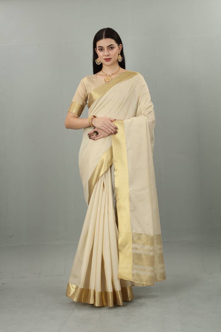 Kerala saree also termed as Kerala Kasavu saree is cherished for its simple yet graceful appearance. The golden border on the cream or off-white fabric gives a very clean and traditional look. The saree itself is very minimal in design and hence the jewelry becomes an integral part in completing the entire look. The perfect kind of gems can amplify the beauty and bring the required classic touch without making the outfit look heavy.